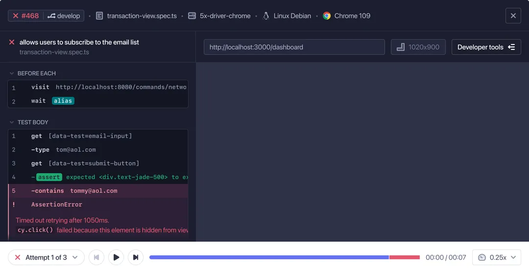 Monitor your test suite’s health with in-depth analytics. Cypress surfaces failing and flaky test result trends and config changes that affect your test suite’s performance.
