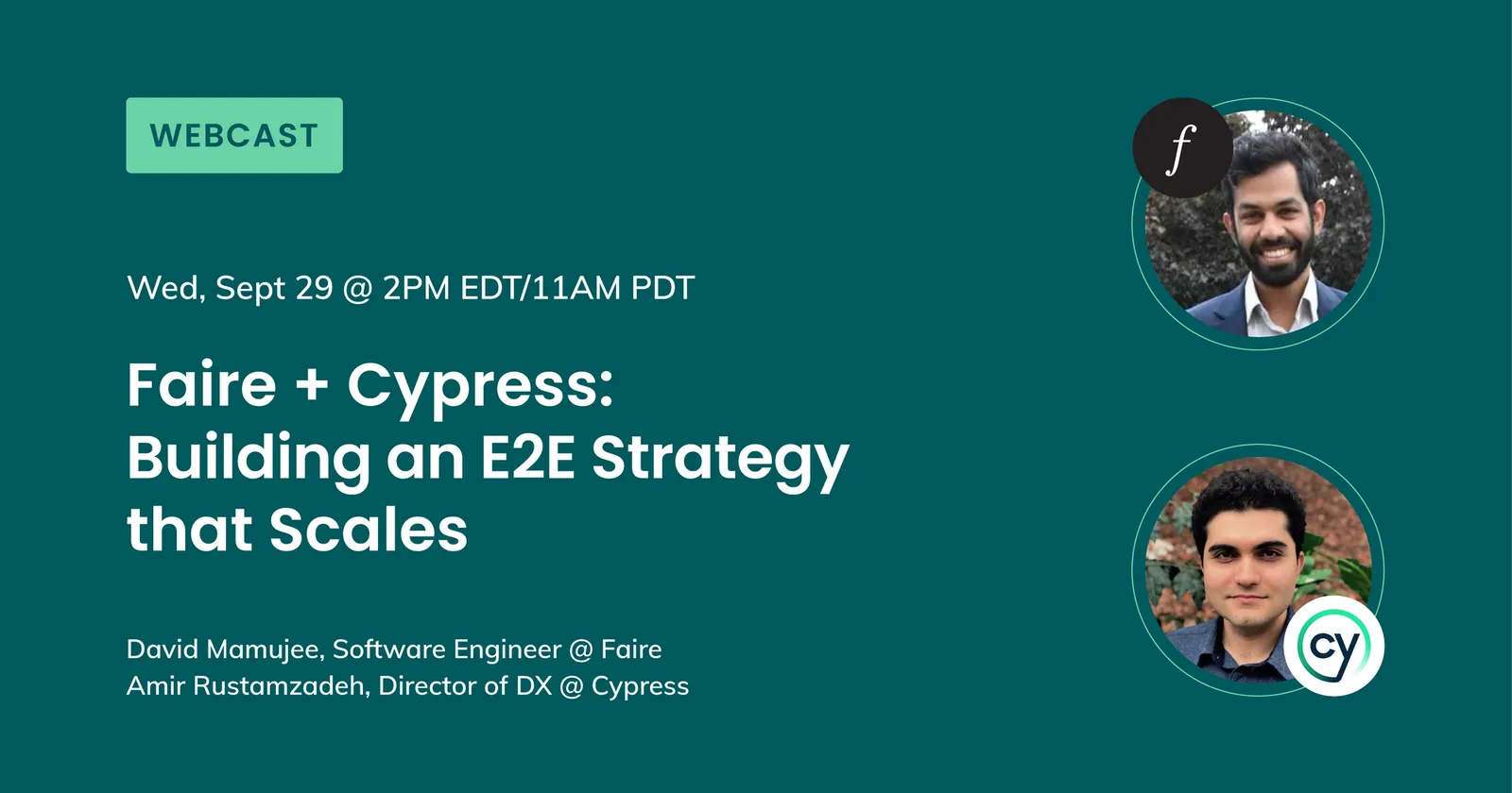 Faire’s fast-growing online marketplace enables over 30,000 independent brands to connect with over 250,000 retailers across the world. Join us Wednesday, September 29th at 2:00pm EDT/11:00am PDT to find out how the team built their E2E testing setup from scratch using Cypress, and how they accomplished a scalable release verification strategy with nearly 100 front-end and back-end developers writing Cypress tests.